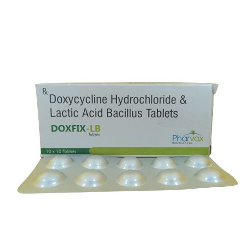 Doxycycline Hydrochloride and Lactic Acid Bacillus Tablets contain Doxycycline Hydrochloride and Lactic Acid Bacillus. Doxycycline Hydrochloride stops the synthesis of essential proteins that are required for bacteria survival and, therefore kills the harmful bacteria. Lactic Acid Bacillus helps restore the good bacteria balance in the gut which may have been affected due to antibiotic use or infections in the body. Doxycycline Hydrochloride and Lactic Acid Bacillus together treat bacterial infections in the body.